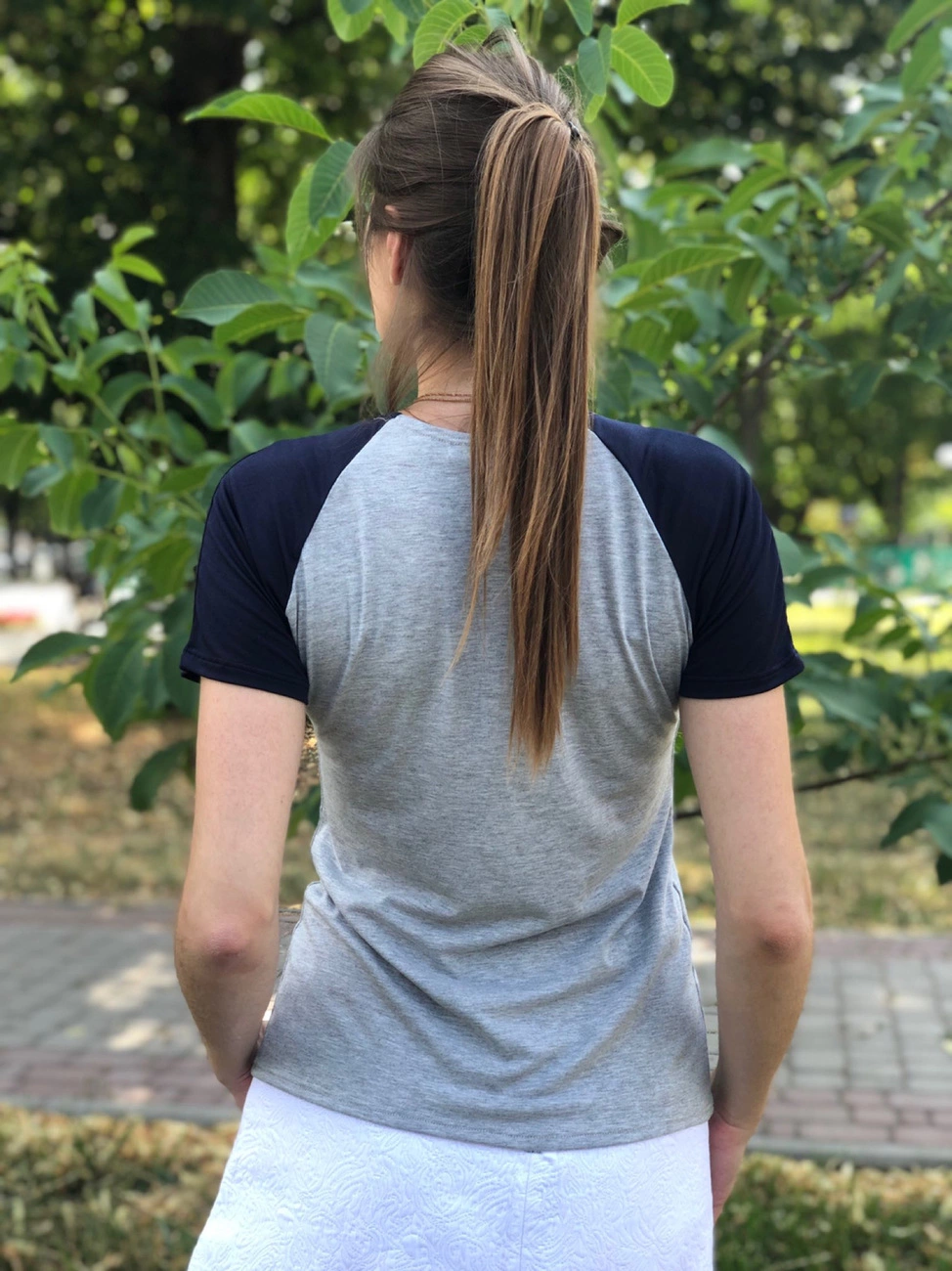 Женская футболка серого цвета с синими рукавами Lytche 003g
