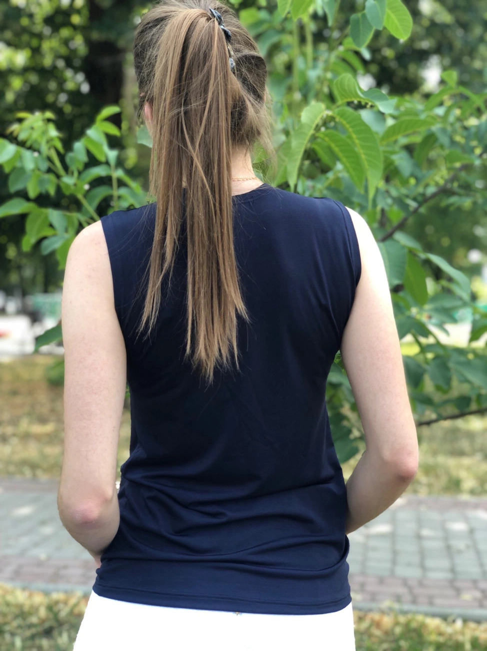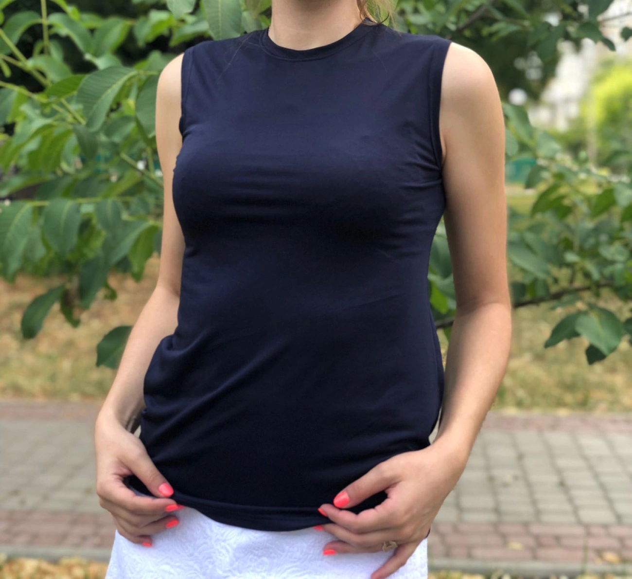 Женская футболка без рукавов выполнена из синтетического материала: Масло.